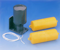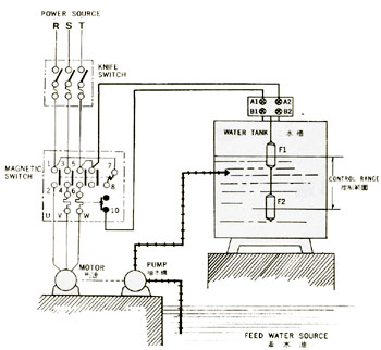 水源处的控制器在水面低于浮球FS2中央时,便停止帮浦,水面超过浮球FS1中央时便恢复正常。 | |