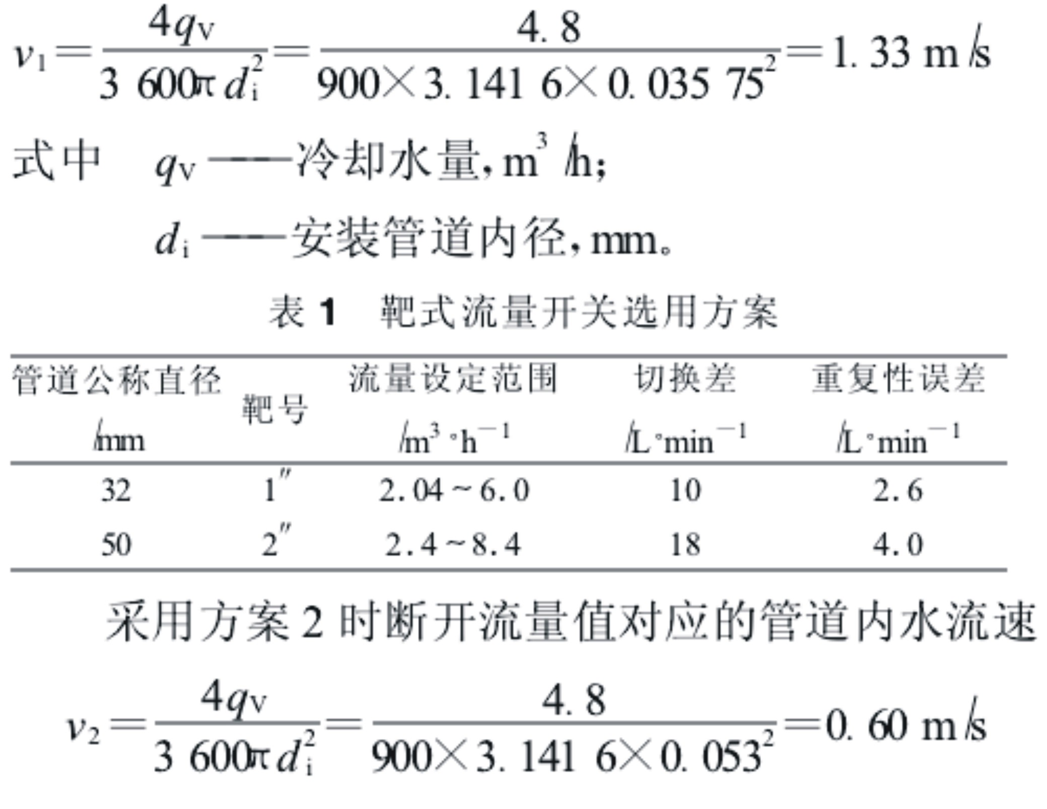 安装管径和靶流片的型号必须根据厂家提供的技术参数来确定,先由空压机所需冷却水量确定流量报警点,再通过流量控制范围选择安装管径和靶流片的型号,最后在试运行时调定靶式流量开关的流量设定值,或者订货时说明由生产厂家调定。以某台型号为LG-25 7喷油螺杆空压机为例,要求的冷却水量为4.8 m3 h,考虑到空压机实际运行时冷却水进水温度高于规定工况15℃的情况,确定靶式流量开关断开流量值为4.8 m3 h。参考某靶式流量开关技术参数表,由流量控制范围可知有2种方案可供选择,如表1所示。按安装管道都采用标准镀锌钢管计算,采用方案1时断开流量值对应的管道内水流速