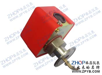 当流速超过设定值时,流体推动桨片,通过HFS-25水流开关内的机械装置带动顶部的微动开关,其单刀双掷开关触点(SPDT)可使一个回路导通,而同时切断另外一个回路.该水流开关通常使用在需要联锁作用或"断流"保护的场所。可调整桨片的数量及修整桨片长度,以适应不同管径及流速的需求。