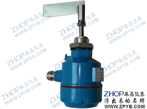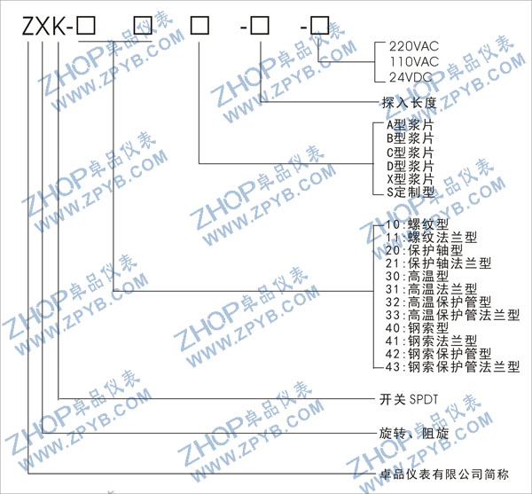 ZX型阻旋式料位开关是利用微型马达做驱动装置,传动轴与离合器相连接,当未接触物料时,马达正常运转,当叶片接触物料时,马达停止转动,检测装置输出一接点信号,同时切断电源停止转动。当物料下降时叶片所受阻力消失,检测装置依靠扭力弹簧恢复到原始状态。针对不同比重的物料扭力大小可以调节。